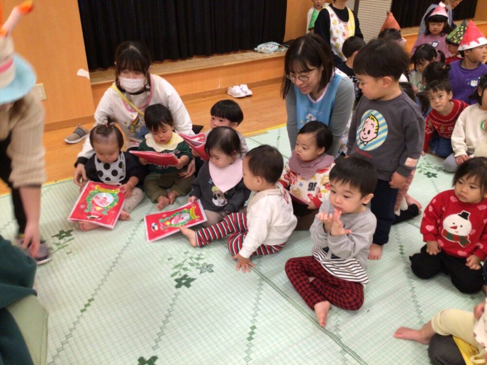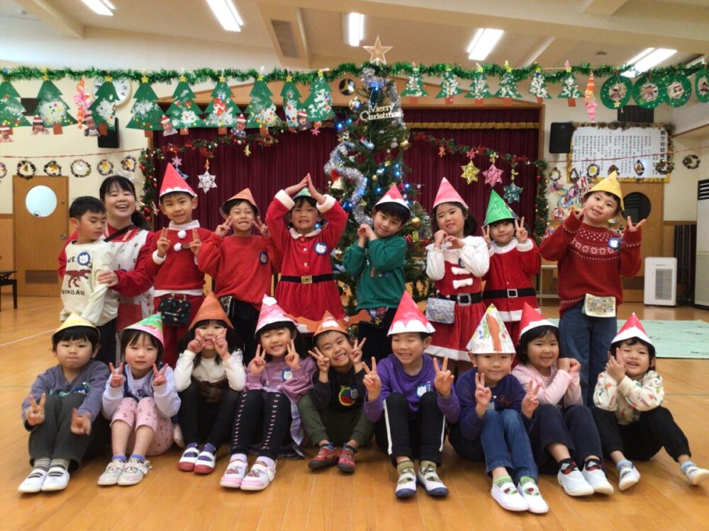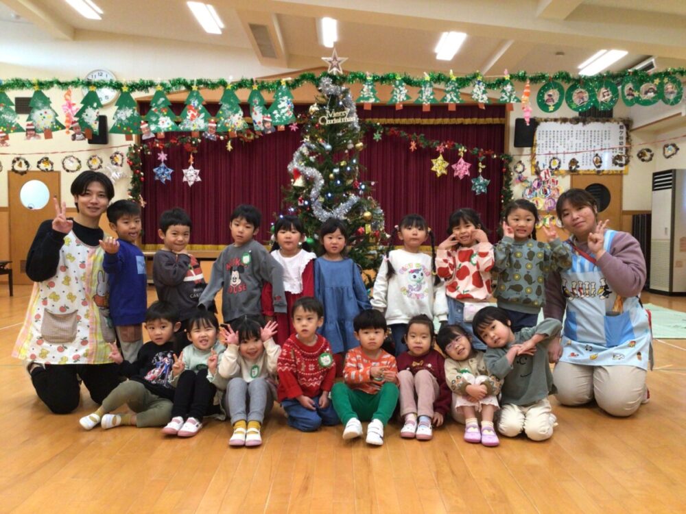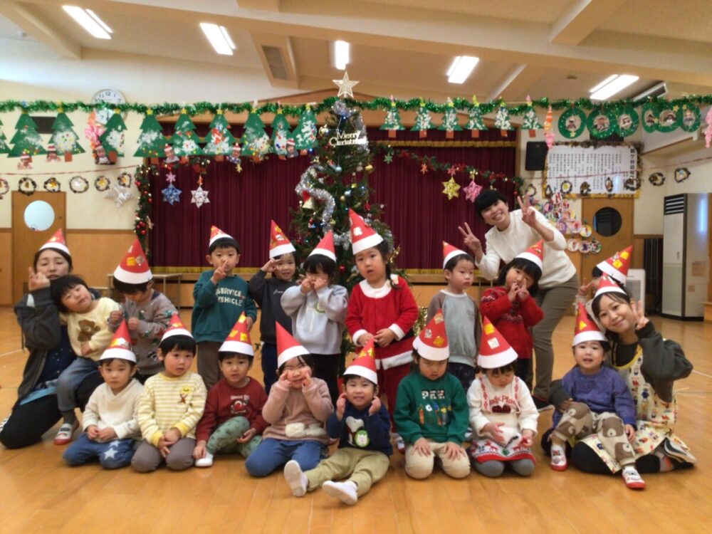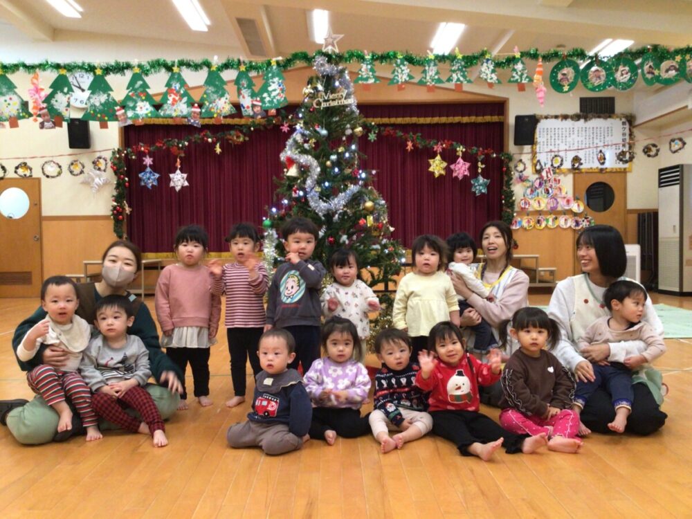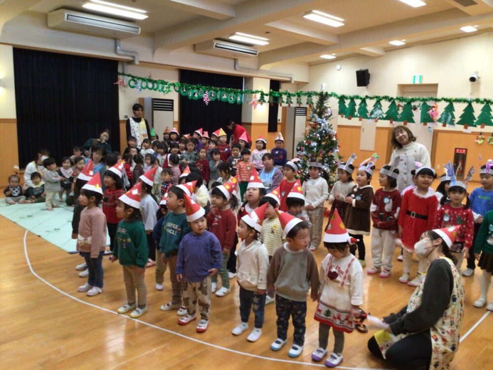 12月23日にクリスマス会がありました🎅大きいクラスの子ども達からは「明日はクリスマス会だね🎵」などの声が聞かれ、みんな保育園のクリスマスを楽しみにしているようでした。当日はサンタやトナカイの服、クリスマス柄やクリスマスカラーの服装で登園する子ども達もたくさんいて😃クリスマスの雰囲気を盛り上げてくれました🎄