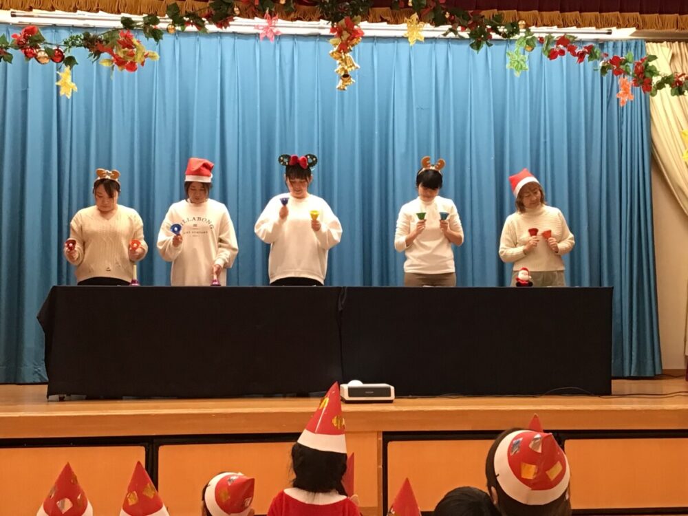 オープニングは職員のハンドベル演奏🔔『♬もろびとこぞりて』『♬ジングルベル』2曲の演奏をききました!『ジングルベル』は子ども達がハンドベルの音色と一緒に歌ってましたよ🎤