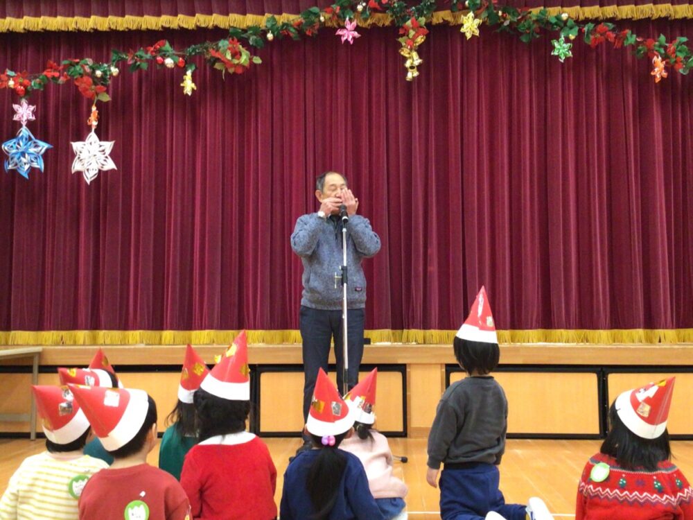 会のサプライズその1は園長先生のハーモニカ演奏♪『きよしこのよる』『おしょうがつ』の2曲を演奏してくれました😊園長先生の初めて披露されたスペシャルかくし芸に子ども達も職員も「すごーい!」と拍手喝采でした👏
