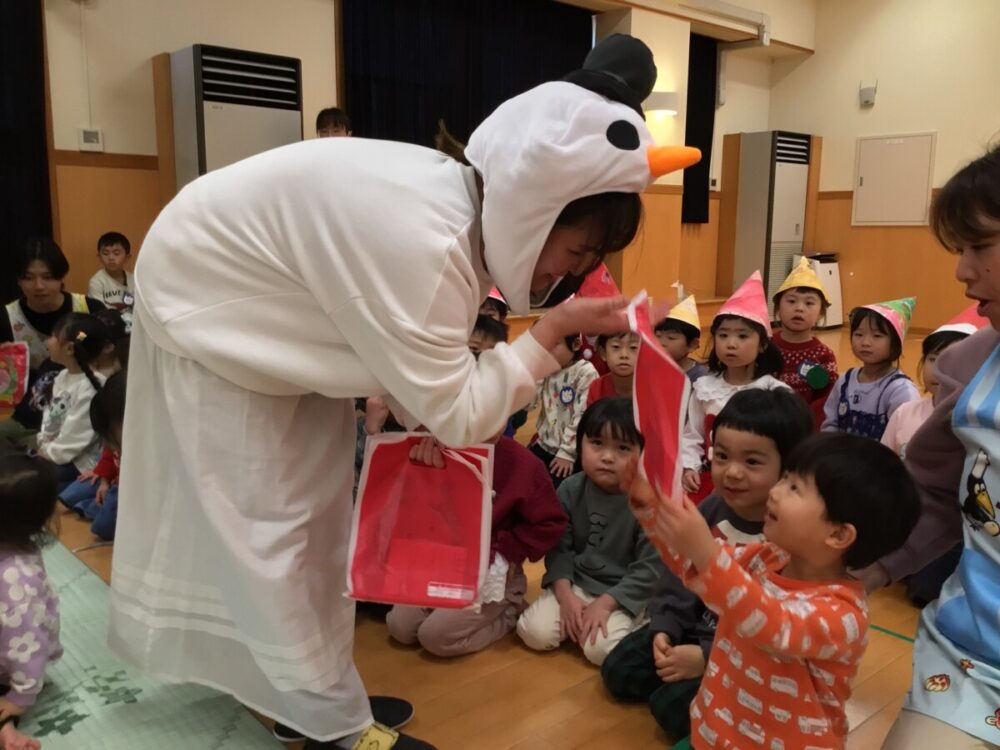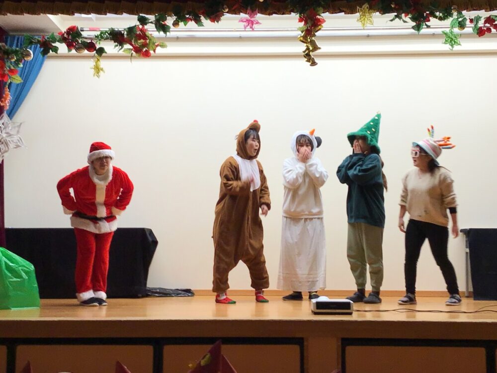 サプライズその2は職員の寸劇。サンタクロースの使いでやってきたサンタとクリスマスに因んだキャラクターたちが登場!空から落ちて抜けなくなった大きな白い袋を『おおきなかぶ』みたいに引っ張ると・・・すぽんと抜けた大きな袋にはマードレの子ども達へのプレゼントが入っていました😃