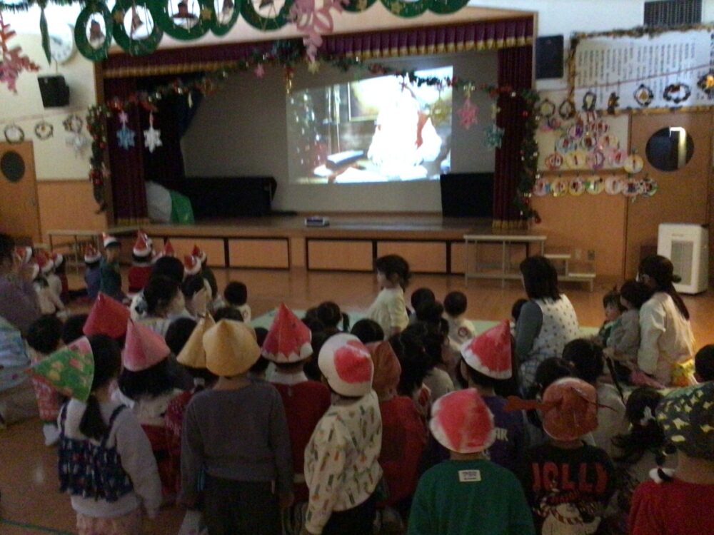 クリスマス会のホールの装飾は、大きなクリスマスツリーの他に各クラスで子ども達が製作したリースなども飾っていて、子ども達のワクワクが更に高まる素敵な会場でした⭐